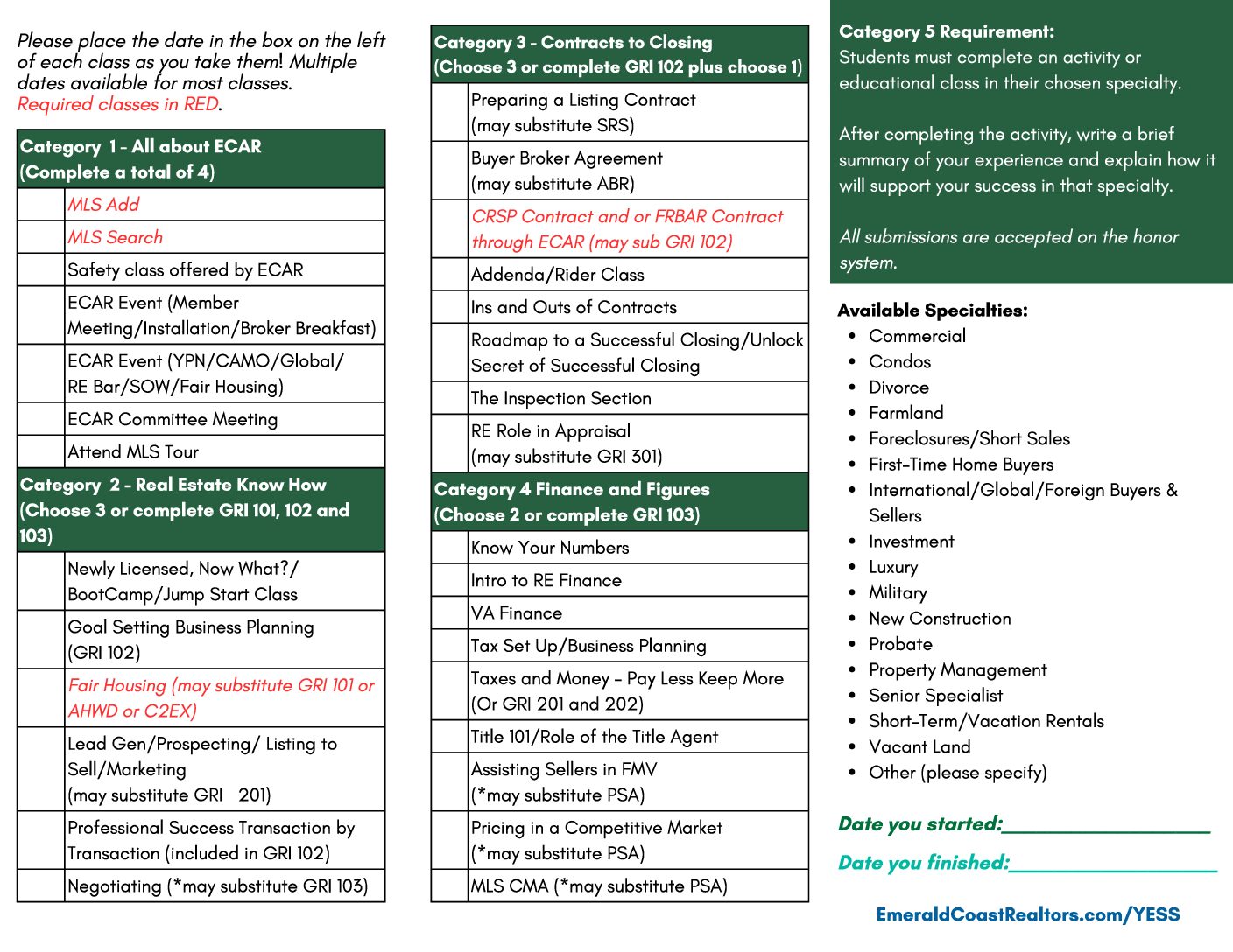 Follow the YESS! Program with this course roadmap: